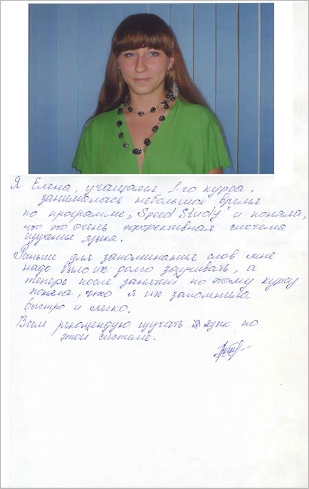 Я Елена, учащаяся 1-го курса, занималась небольшое время по программе "Speed Study" и поняла, что это очень эффективная система изучения языка.
